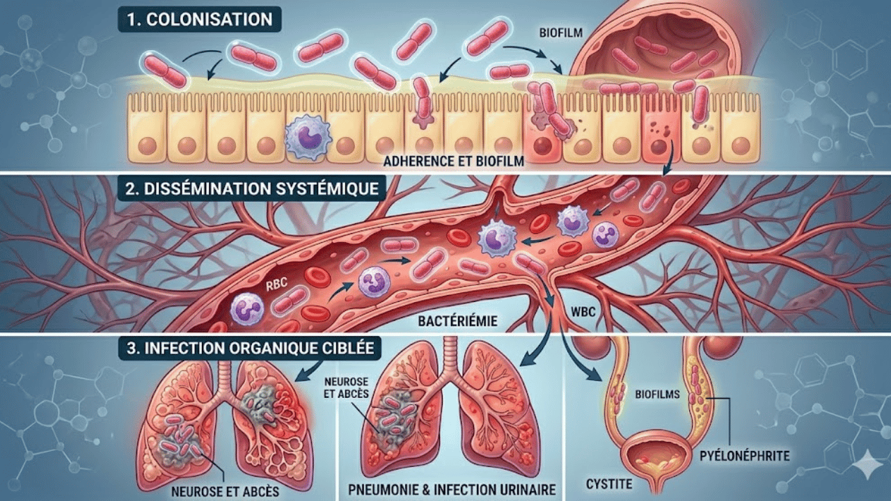 Cette complication est grave car elle peut endommager les néphrons et conduire à une septicémie. De plus, cette bactérie est connue pour sa capacité à former des biofilms sur le matériel médical, ce qui explique pourquoi les infections urinaires à Klebsiella sont souvent récidivantes et difficiles à éliminer définitivement.